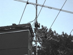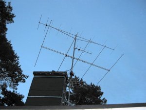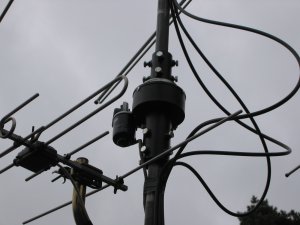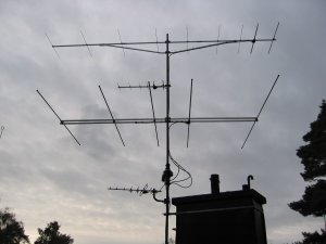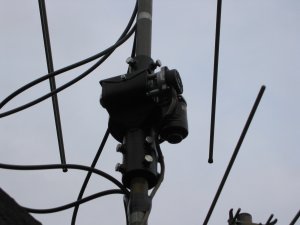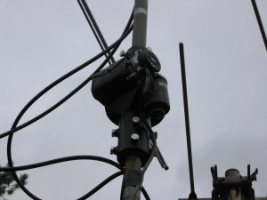 Ulf is using the AlfaSpid rotator to turn a set of small VHF and UHF antennas, 9 element for 2 m, 6 element for 70 cm, and a 5 element for 6 m, there is also a TV-antenna below rotator. This array doesn't present much of a load to the rotator, but you can see how easy the AlfaSpid mounts in a pipe to pipe arrangement. With the two sets of heavy duty bearings inside the rotator, it can easily handle the stack without the need for bearings above the rotator.