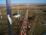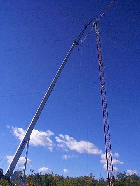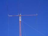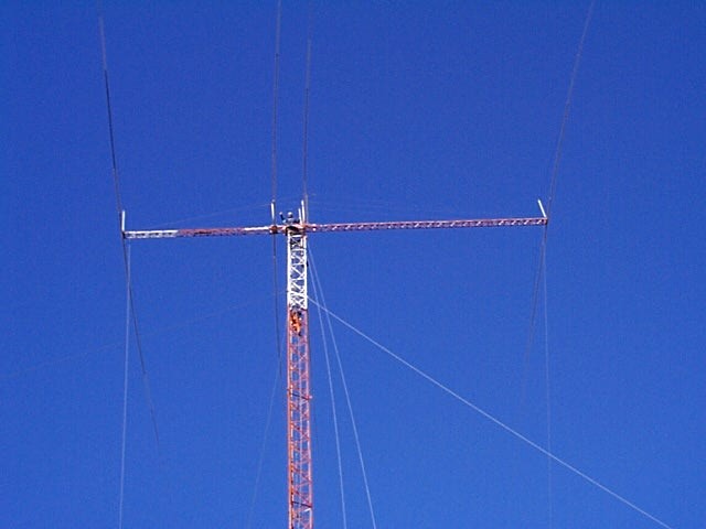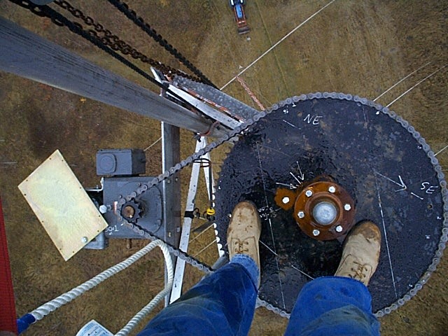 One other problem was the rotor, or more properly the top bearing. I had used a 6000 pound "implement hub" designed for heavy agricultural loads in a stub axle configuration. Even though it would be subject to large offset forces in my application, I know it would have to carry such weights in it's normal usage. Well, I was quite wrong again as it showed signs of leaning early on. Here you can see Barry VA6DX standing on the sprocket that is bolted to the hub. While nothing had failed to the point of being dangerous, it was time to do it "more right" this time. Getting the yagi in position at the start (1998) had been a full 2 day job using a gin pole and winch - taking it down that way would be not much less work and certainly not fun.